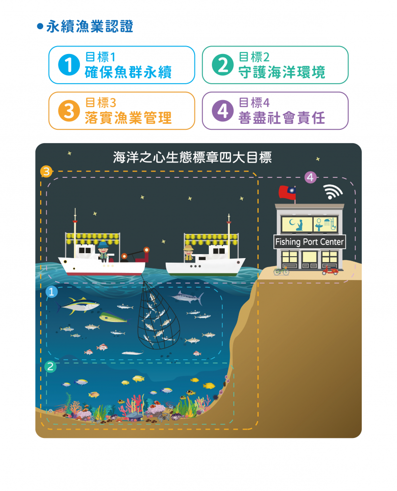 聯合國糧農組織於2009年公告《海洋撈捕漁業之魚和漁產品生態標章準則》,建議生態標章需在「尋求認證的漁業及系群」、「漁業行為對生態系的嚴重衝擊」、「管理系統」三項領域明訂必要條件。海漁基金會據此於《海洋之心永續標章漁業驗證標準》當中設計「確保魚群永續」、「守護海洋環境」、「落實漁業管理」三個關注面向。